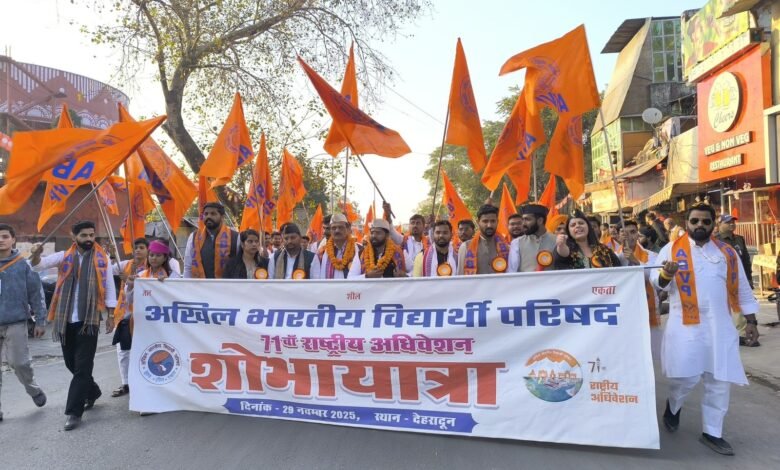 देहरादून। अखिल भारतीय विद्यार्थी परिषद (अभाविप) का 71 वाँ राष्ट्रीय अधिवेशन 28 से 30 नवंबर के मध्य देवभूमि, उत्तराखण्ड के परेड ग्राउंड में बसाए गए ‘भगवान बिरसा मुंडा नगर’ में जारी है। इस अधिवेशन स्थल से निकलकर दर्शनलाल चौक तक 4.5 किमी लंबी शोभायात्रा आयोजित हुई।