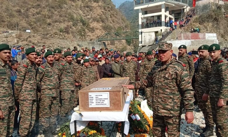 ऊखीमठ । अरुणाचल प्रदेश में मातृभूमि की सेवा करते हुए वीरगति को प्राप्त हुए शहीद हवलदार रविन्द्र सिंह (36) को आज पूरे सैन्य सम्मान के साथ अंतिम विदाई दी गई। आगर, दशज्यूला क्षेत्र के रहने वाले शहीद हवलदार रविन्द्र सिंह 15 गढ़वाल राइफल्स में तैनात थे। अरुणाचल के अलोंग में ही भारत मां की सेवा करते हुए वे शहादत को प्राप्त हो गए।अपने पीछे एक बेटा और एक बेटी को छोड़ गए हैं।