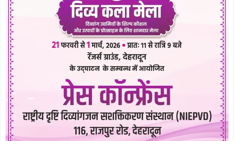 देहरादून । राजधानी देहरादून में भारत सरकार द्वारा संचालित नेशनल हैंडीकैप्ड फाइनेंस एंड डेवलपमेंट कॉरपोरेशन के तत्वाधान में दिव्य कला मेला का आयोजन किया जा रहा है। यह मेला 21 फरवरी, 2026 से शुरू होकर 1 मार्च, 2026 तक रेंजर ग्राउंड, देहरादून में आयोजित होगा।